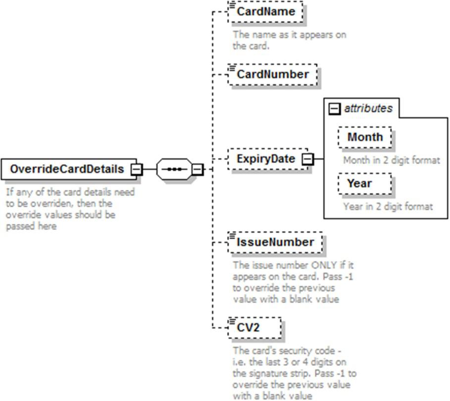 This describes the OverrideCardDetails child node of the root PaymentMessage node