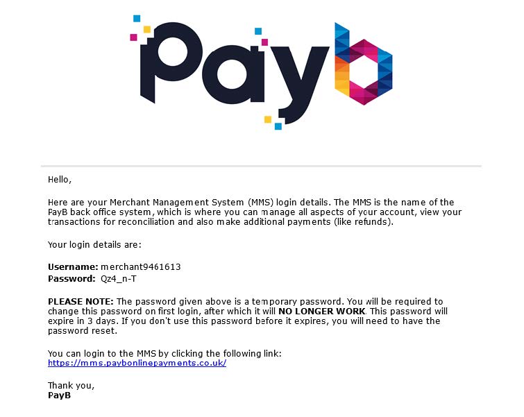 username will begin with the word ‘merchant’ followed by a string of numbers. Type in the temporary password exactly as it appears in the email (please note passwords are case sensitive) then click ‘Login to MMS’. If log in has been successful you will see the following message (Figure 5):