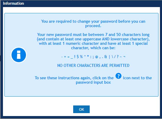 Upon clicking ‘OK’, you will be asked to change from your assigned temporary password to a more memorable “strong” password. Passwords must meet certain criteria. When entering your new password you will see an indicator, which will turn green when all the password criterion are met.
