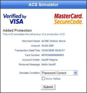 The test system comes complete with an ACS simulator, which allows your developer to simulate the most common responses that might come back from the cardholder’s bank’s access control server.